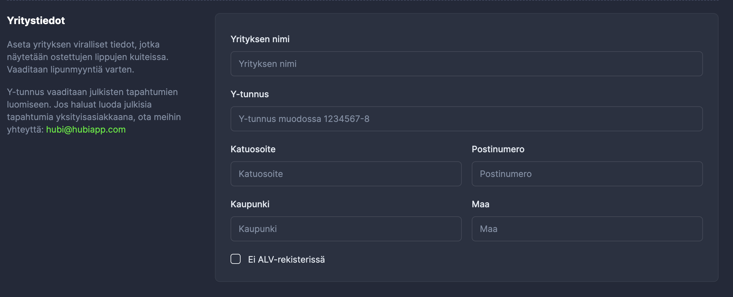 Kun olet lisännyt Y-tunnuksen profiiliisi, voit luoda julkisia tapahtumia, jotka tulevat näkyviin sovelluksessa kaikille käyttäjille.